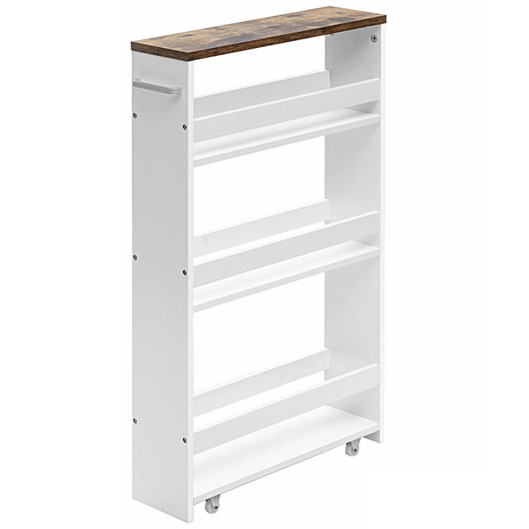 2.Space-saving Design: This 4-tier slim storage cart can utilize every corner in your room, and the compact design with 5.1" width is specially designed for narrow space. This rolling cart is a great organizer for makeup, utensils, medicine, canned food, spices, detergent, soaps, pet supplies or kid's toys, toilet cleaners, etc.
