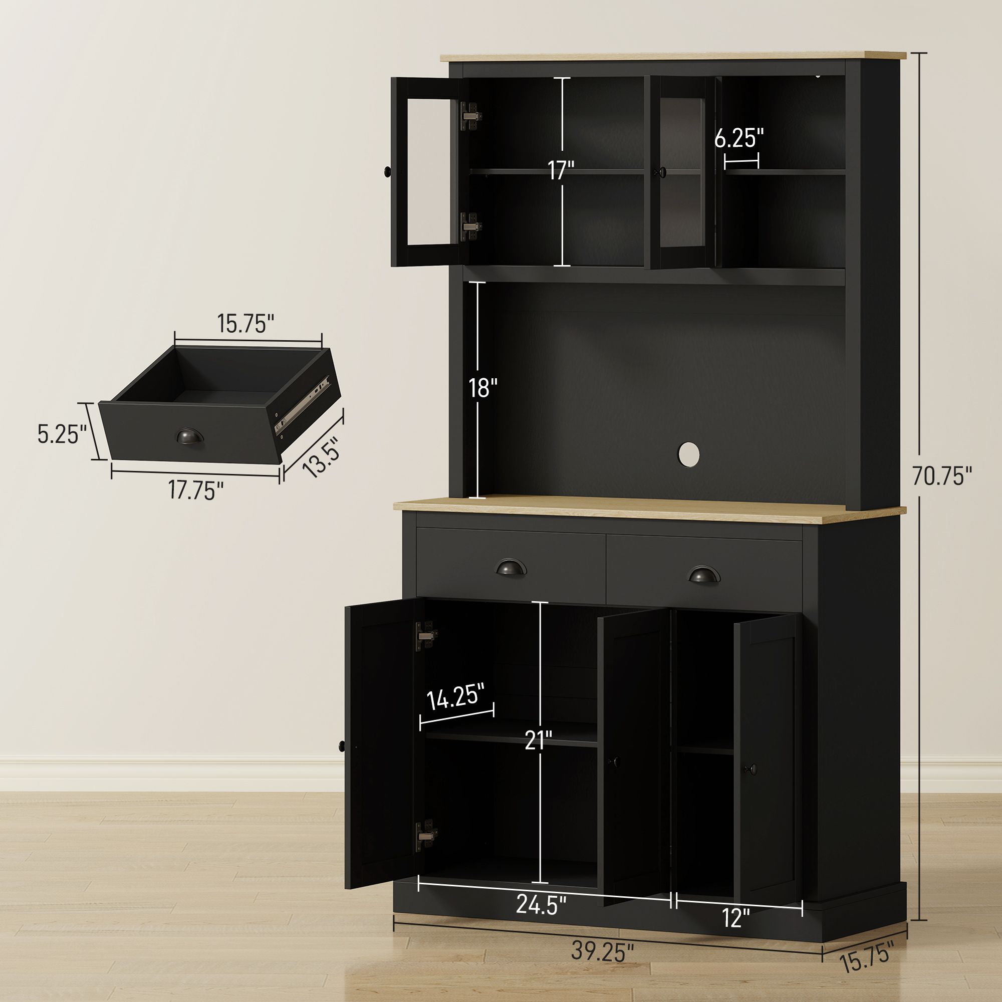 1.- Large Storage Space: Hide clutter in the cabinets below, store items in drawers, and use the countertop with open shelves for daily use. The top glass-door cabinet of this hutch displays dishes or glassware, making storage part of your kitchen's style